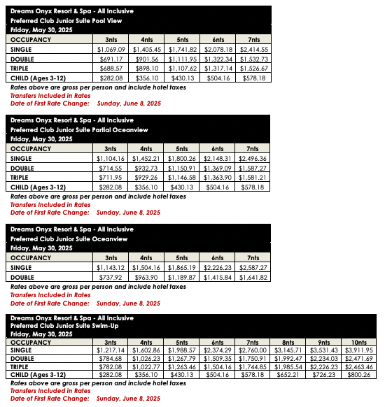 ROOM RATES FOR DREAMS ONYX RESORT & SPA